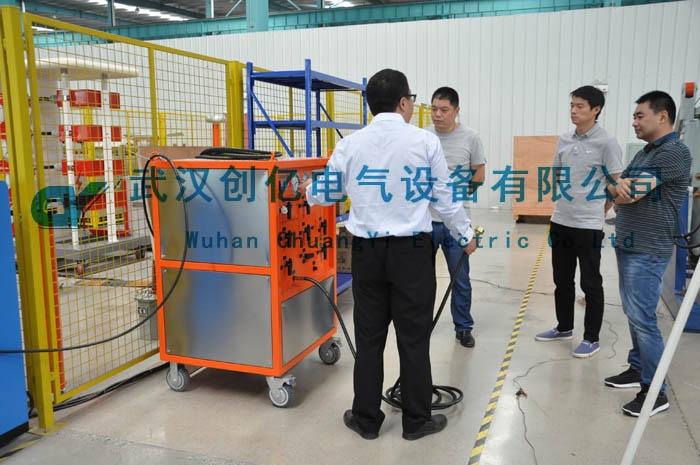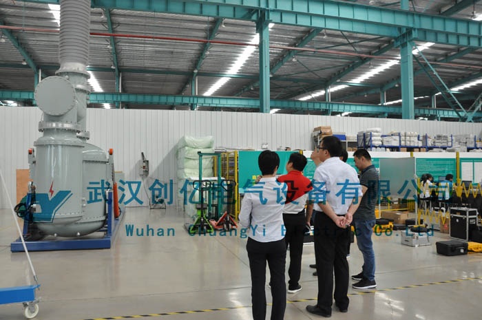 在參觀過程中,客戶對我司即將出口的新加坡的GIT(SF6移動式工頻耐壓局放試驗裝置)表現出濃厚的興趣。