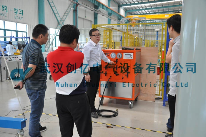 隨后客戶前往我司廠房對現有的SF6試驗設備樣品進行詳細的了解考察。由我司的技術人員詳細講解了SF6氣體回收裝置的試驗原理、操作以及技術參數等。