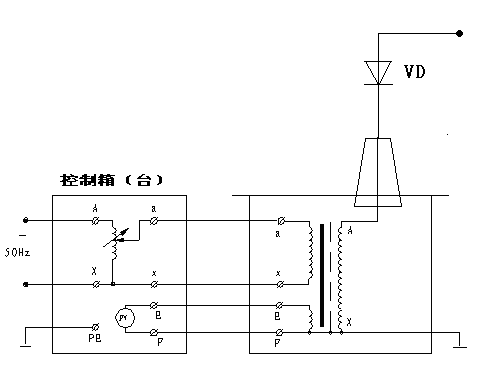 圖中高壓輸出的上端裝有高壓硅堆,串接在高壓回路中作半波整流,以獲得直流高電壓。當取下不接高壓硅堆時,作為直流輸出狀態。
