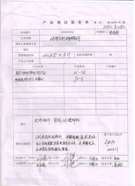 2014-08-21 山東馳戈電氣設(shè)備有限公司進(jìn)行調(diào)試服務(wù),調(diào)試產(chǎn)品:CYKC-12A 高壓開關(guān)動特性測試儀 CYJS-6A 絕緣靴手套耐壓泄露儀