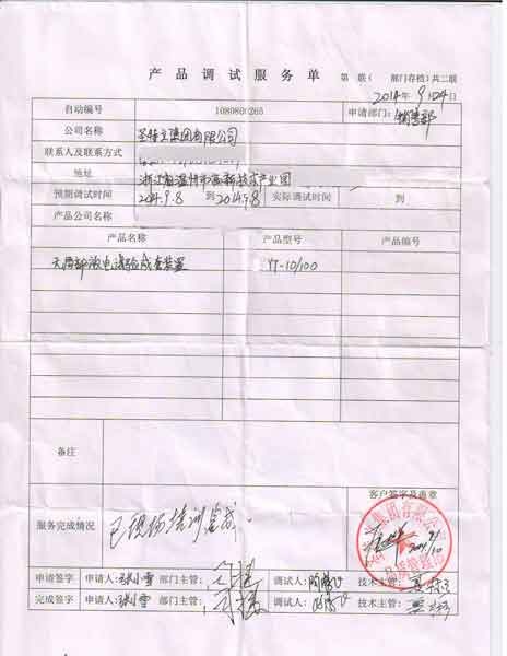 2014-10-09 浙江圣特立電氣有限公司進行調試服務,調試產品:CYYT-10/100無局部放電試驗成套裝置 CYYT-10/100、無局部放電試驗成套裝置1070420201