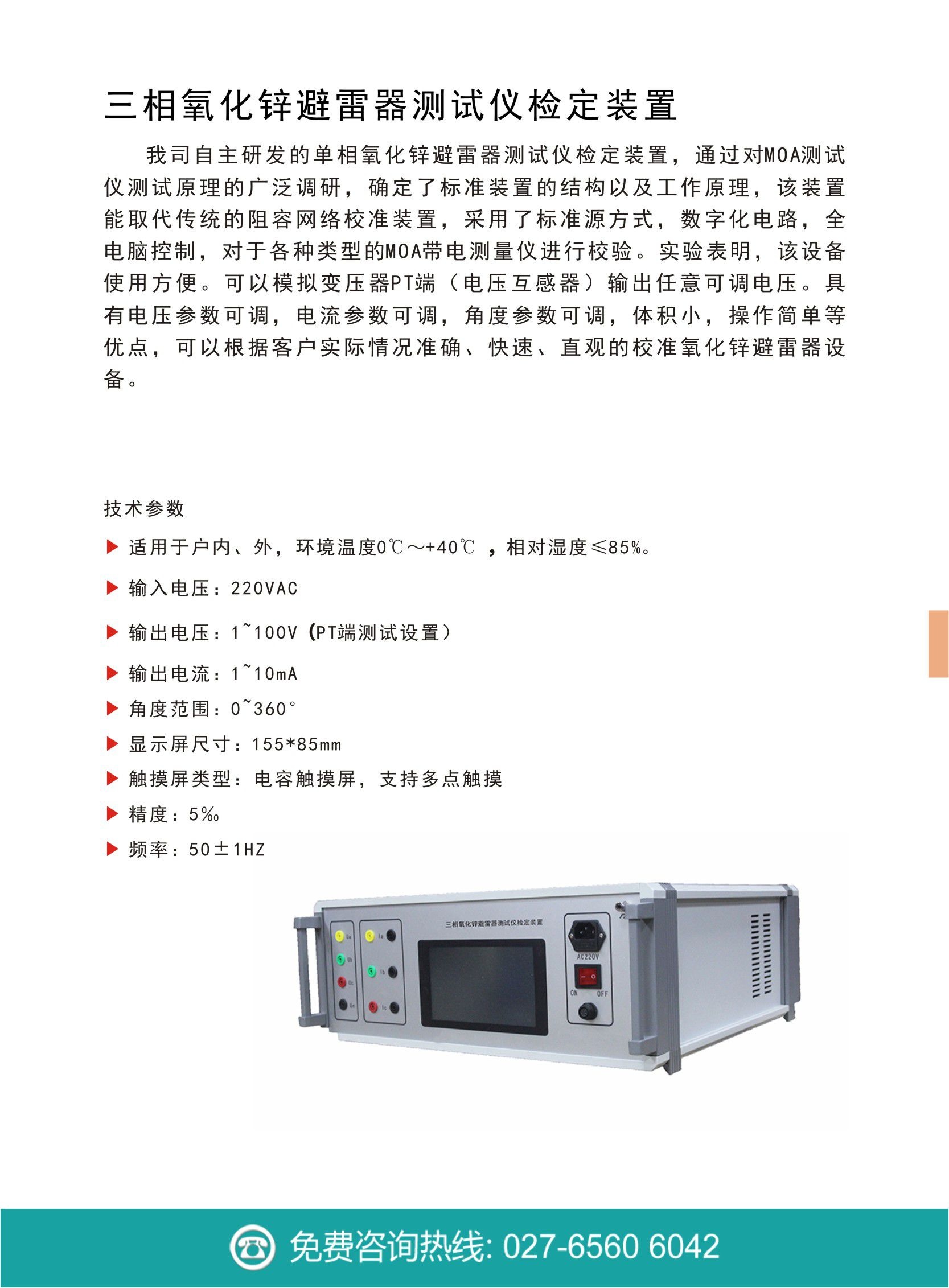 本裝置可模擬輸出氧化鋅避雷器運行現場所需要的交流電壓和漏電流信號,主要用來檢定單相或三相(氧化鋅避雷器測試儀)在線測量時的準確性和穩定性,也可以在其他場合作為三相交流信號數控源使用。