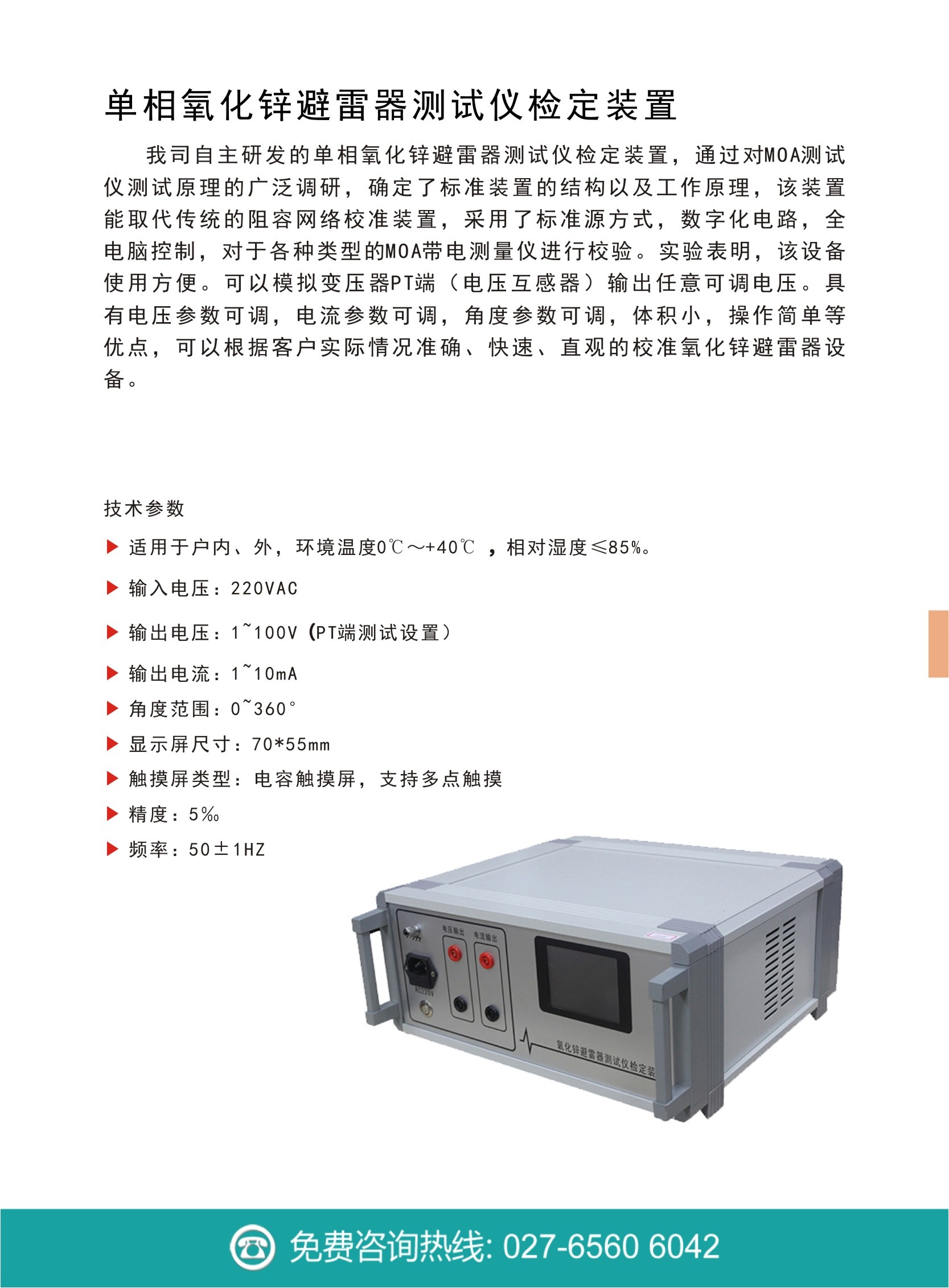 創億電氣自主研發的CY-301單相氧化鋅避雷器測試儀檢定裝置,通過對MOA測試儀測試原理的廣泛調研,確定了標準裝置的結構以及工作原理,該裝置能取代傳統的阻容網絡校準裝置,采用了標準源方式,數字化電路,全電腦控制,對于各種類型的MOA帶電測量儀進行校驗。實驗表明,該設備使用方便。可以模擬變壓器PT端(電壓互感器)輸出任意可調電壓。具有電壓參數可調,電流參數可調,角度參數可調,體積小,操作簡單等優點,可以根據客戶實際情況準確、快速、直觀的校準氧化鋅避雷器設備。