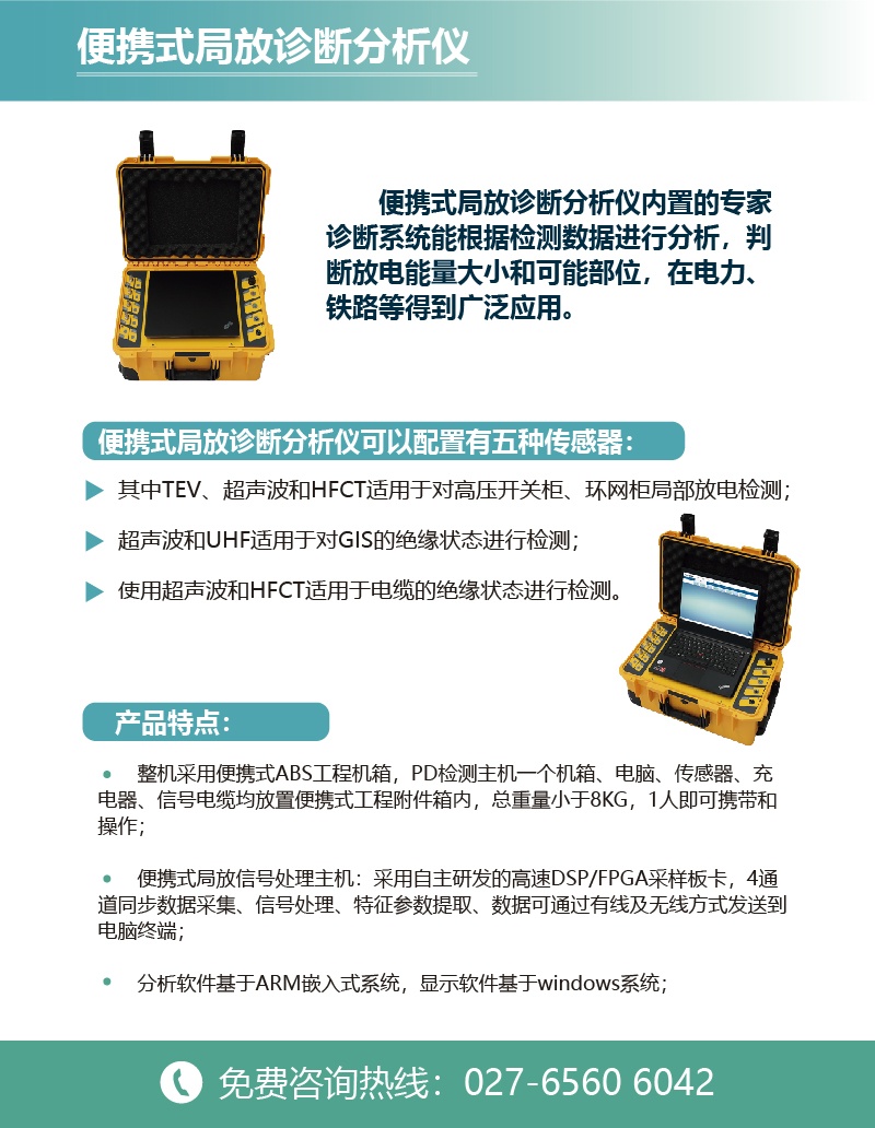 整機采用便攜式ABS工程機箱,PD檢測主機一個機箱、電腦、傳感器、充電器、信號電纜均放置便攜式工程附件箱內,總重量小于8KG,1人即可攜帶和操作