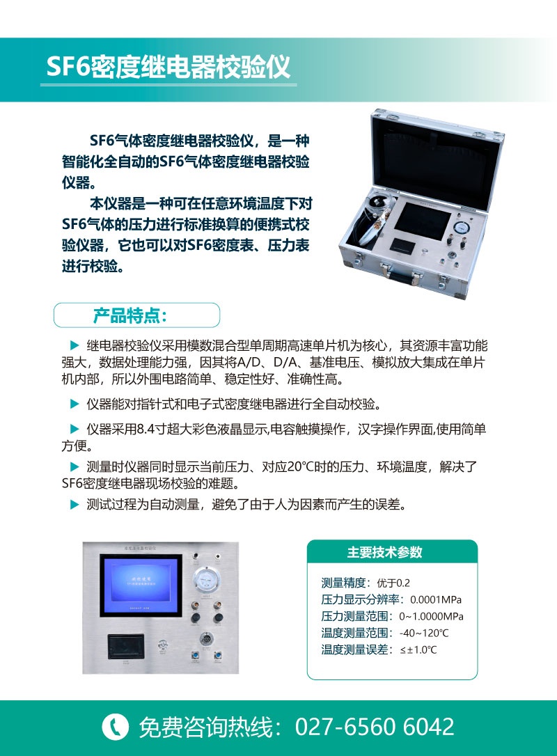 本儀器是一種可在任意環境溫度下對SF6氣體的壓力進行標準換算的便攜式校驗儀器,它也可以對SF6密度表、壓力表進行校驗。