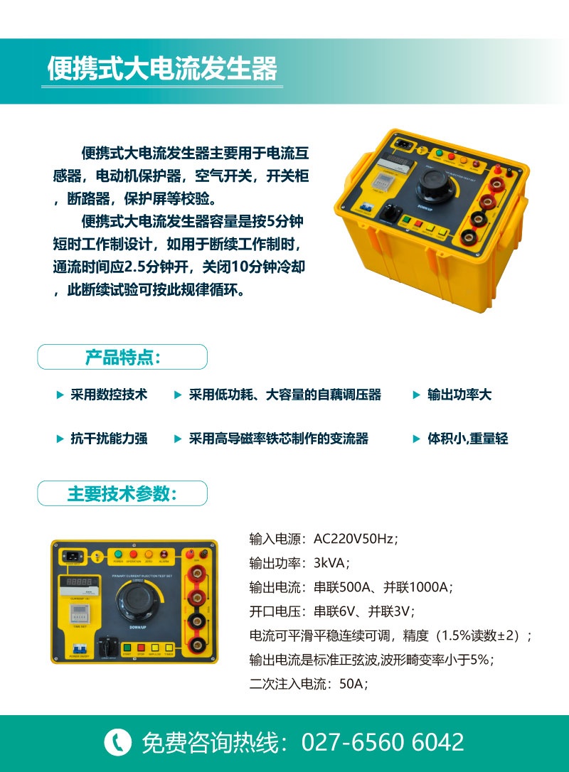 CYSL-BX-200便攜式大電流發(fā)生器是通過多年實踐經(jīng)驗自行研制開發(fā)的測試設(shè)備,它集國內(nèi)外同類產(chǎn)品的優(yōu)點于一身,采用數(shù)控技術(shù),抗干擾能力強,和上一代升流器相比,由于采用低功耗、大容量的自藕調(diào)壓器和高導(dǎo)磁率鐵芯制作的變流器,具有輸出功率大,體積小,重量輕等優(yōu)點。主要用于電流互感器,電動機保護器,空氣開關(guān),開關(guān)柜,斷路器,保護屏等校驗。