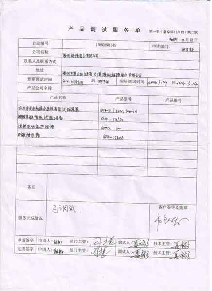 2014-03-14 赴深圳媽灣電力有限公司進行調試服務,調試產品:CYZG-S /60kV/300mA水內冷發電機通水直流高壓試驗裝置, CYTF-200/50調頻串聯諧振試驗設備, CYFQ-100遙控電動保護球隙, CYYD-15kVA 電源操作箱