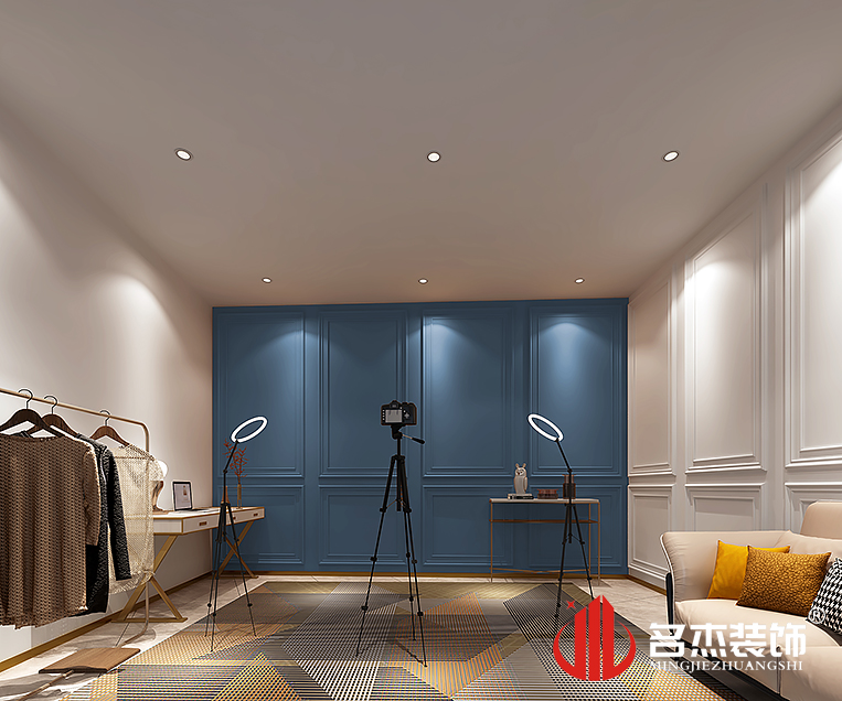 在直播間和展廳區(qū)域使用不同的造型增加整體的設計感,天花造型也不會過于浮夸,部分墻體使用時下流行的霧霾藍來作為點綴色,使得整體的時尚感更加特出。