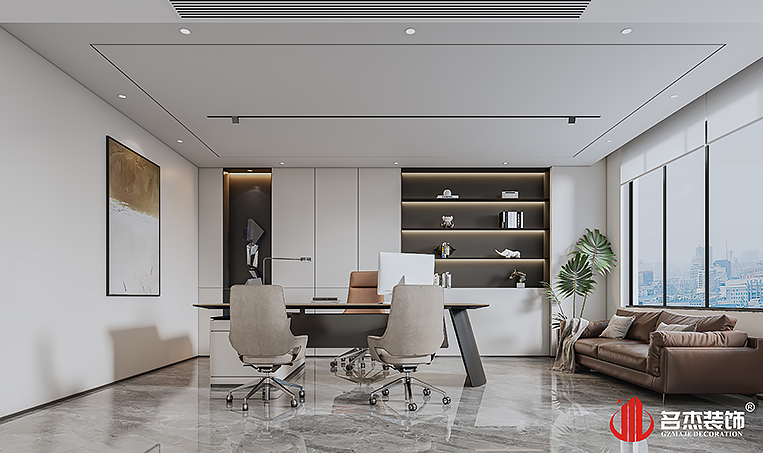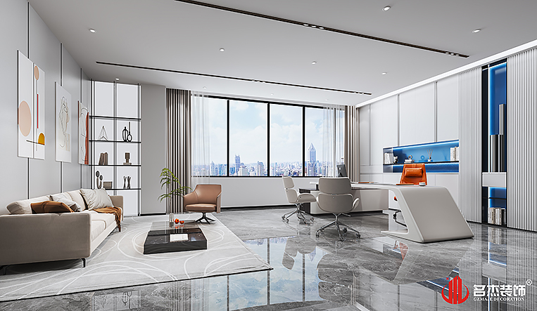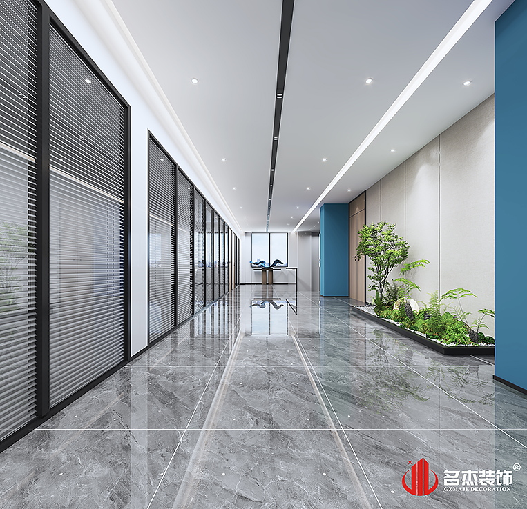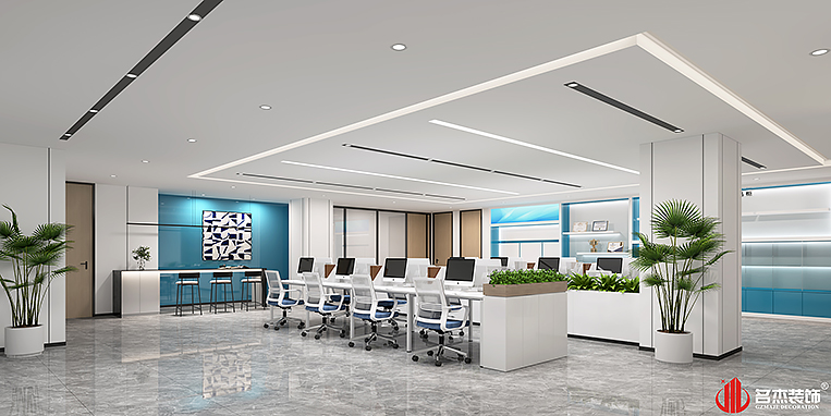 前臺區域利用層高的優勢,搭建出一個大氣且時尚的區域。在背景墻部分加入部分簡約的且不簡單的元素,讓空間變得更加有層次感,土豪金作為空間的點綴色,也為這個前臺區域增加了不少的輕奢感。大部分區域都是做了吊頂的,通過這樣的方式讓整體風格得到了統一,同時這樣簡約的吊頂也能夠給空間帶來不一樣的層次感??臻g中藍色點綴也是隨處可見的,能夠很好的感受到企業文化。#工裝裝修#