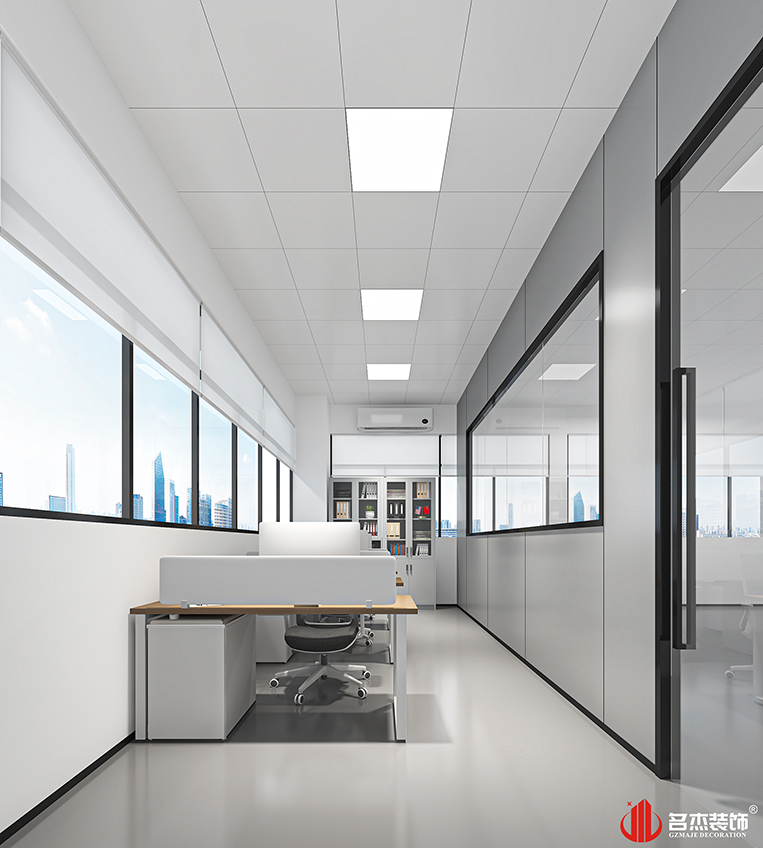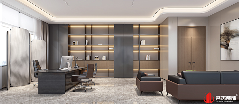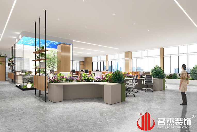 設計團隊在展廳區域使用具有科技元素的藍色,作為該空間的主導色,配合圓弧型的吊頂造型,讓空間具有科技感的同時,還能具有設計層次感。而且前臺區域的設計中,讓企業LOGO色作為空間的點綴色,使用在前臺桌子上,搭配造型感十足的吊頂,讓空間更具有設計層次感。#廣州辦公室裝修#