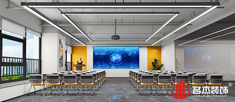 整體的辦公裝修設計空間采用的是時尚簡約風格,大量的使用logo色讓空間不再單調的同時,還能增加整體空間的設計層次感。采用弧形玻璃隔斷為的就是增加設計的設計感,也讓空間綻放出不一樣的設計感。