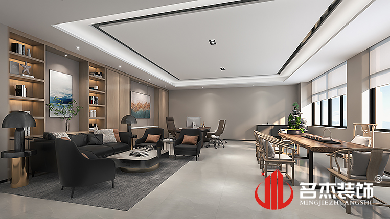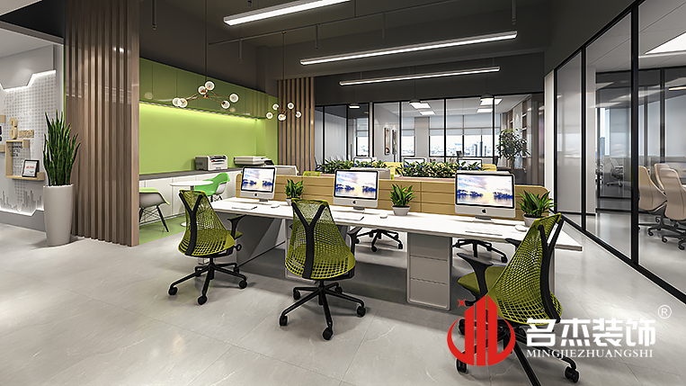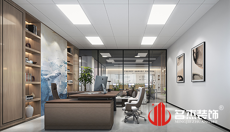 整體使用原木色調的材料來奠定現代簡約的風格,在辦公區域使用綠色作為點綴色,讓自然的元素加入到整體辦公室裝修設計當中,從而引申出一種親近自然的氛圍。總經理室里面加入茶室和接待的功能,在接待重要客戶的時候起到一個非常不錯的效果。