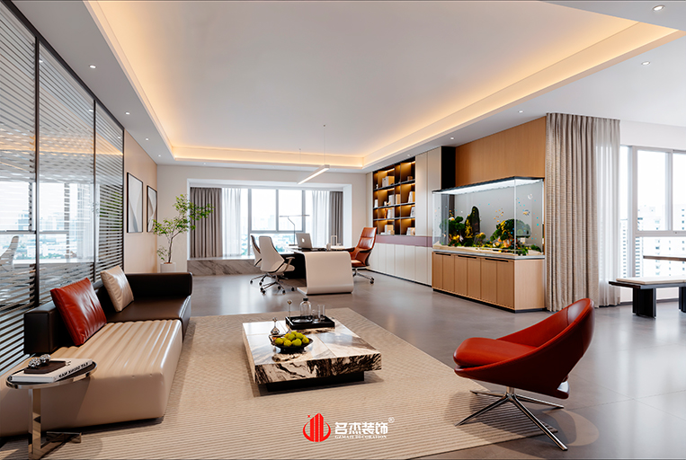 設計團隊雖然說采用時尚簡約風格來作為這次的主導設計風格,但也汲取其他風格的特色,將這些元素特色融入到這個辦公室裝修設計空間當中。多個空間使用碳晶板來作為空間的點綴材料,讓空間充斥著不同以往的氛圍,營造出一種充滿干勁的空間氛圍感。#廣州辦公室裝修設計公司#