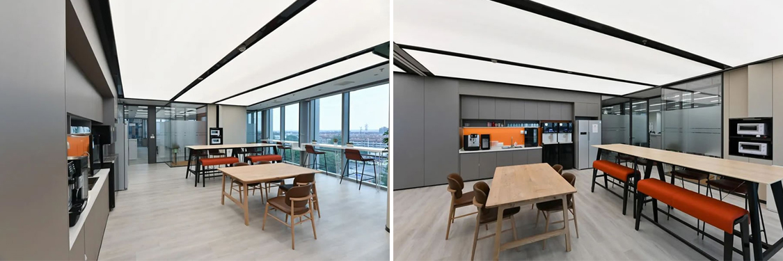設(shè)計團隊特意選擇了一處大型開敞的臨窗場地,在酷炫的3D裸眼展示室旁邊也打造了衣蛾4S店的培訓和茶水間二合一空間,來滿足客戶快速發(fā)展的團隊培訓和新品發(fā)布,員工活動的需求。臨近建筑幕墻的位置,設(shè)計團隊就設(shè)計了一派沿窗的休閑階梯造型臺階。員工部分選用了可升降的辦公桌,來滿足員工辦公的個性化需求,白灰色的家具搭配,混搭淺木色的休閑洽談區(qū)域,地面則是選用環(huán)保地毯來提升空間品質(zhì)和美感。