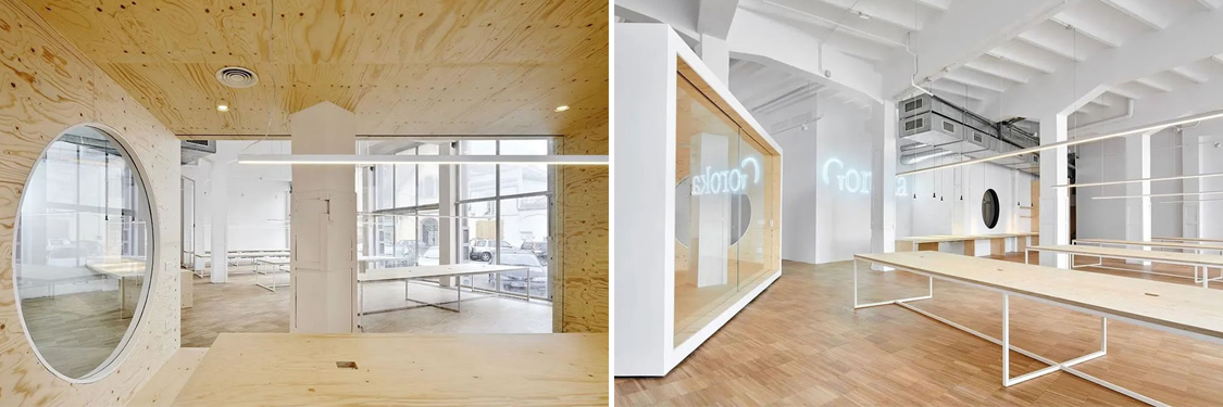 室內(nèi)僅出現(xiàn)一個(gè)單一元素結(jié)構(gòu),一個(gè)白色的大型建筑盒子,也是會(huì)議室所在的地方。這里這處大型空間唯一的封閉空間,巧妙地將工作區(qū)和管理區(qū)分隔開,同時(shí)通過視覺又將兩個(gè)空間連接在一起。這個(gè)立方體的盒子內(nèi)部采用膠合板進(jìn)行制作,讓人感覺到它像是一個(gè)樹屋,就像是一個(gè)插入空間中的一個(gè)結(jié)構(gòu)柱那般自然。極簡的家具設(shè)計(jì)語言給人一種開放輕盈且通透的感覺,能夠很好地促進(jìn)協(xié)作,同事之間的偶然邂逅能夠促進(jìn)跨部門之間的對(duì)話和協(xié)作。一個(gè)無視覺阻隔,開放通透的空間不僅是一種美學(xué)上的品質(zhì)空間,更是一個(gè)實(shí)用且具有文化特性的空間。